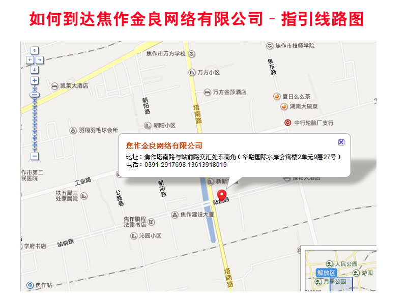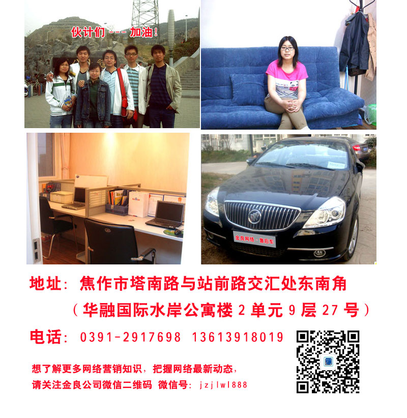 金良網(wǎng)絡(luò )公司-因業(yè)務(wù)拓展需求,搬遷到焦作市塔南路與站前路交叉口東南角(華融國際水岸公寓樓2單元9層27號)。原來(lái)聯(lián)系手機和電話(huà)都沒(méi)有變化,給客戶(hù)(朋友)們帶來(lái)不便,請諒解!網(wǎng)站建設,百度推廣,微信公眾號服務(wù),淘寶店鋪裝修,400電話(huà)辦理,有問(wèn)題聯(lián)系景子良13613918019