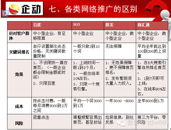 一 .網(wǎng)絡(luò )營(yíng)銷(xiāo)推廣的現狀? 1、網(wǎng)絡(luò )營(yíng)銷(xiāo)成為新時(shí)代的寵兒!互聯(lián)網(wǎng)的發(fā)展,讓越來(lái)越多的人開(kāi)始重視并選擇網(wǎng)絡(luò )營(yíng)銷(xiāo)推廣!網(wǎng)絡(luò )營(yíng)銷(xiāo)大大改變了企業(yè)的營(yíng)銷(xiāo)方式! 二.企業(yè)網(wǎng)站宣傳推廣新助手-商匯通 "商匯通"是國內首家專(zhuān)注于搜索引擎首頁(yè)精準營(yíng)銷(xiāo)的電子商務(wù)云銷(xiāo)平臺,整合企動(dòng)公司8年技術(shù)積累和優(yōu)秀合作平臺,幫助客戶(hù)實(shí)現成百上千個(gè)精準關(guān)鍵詞自然排名8大搜索引擎首頁(yè),方便、快捷、穩定實(shí)現企業(yè)搜索引擎推廣。 三.選擇我們的十大理由 1、五大搜索引擎首頁(yè)排名推廣! 四.商匯通和百度推廣競價(jià),官網(wǎng)優(yōu)化比較 |