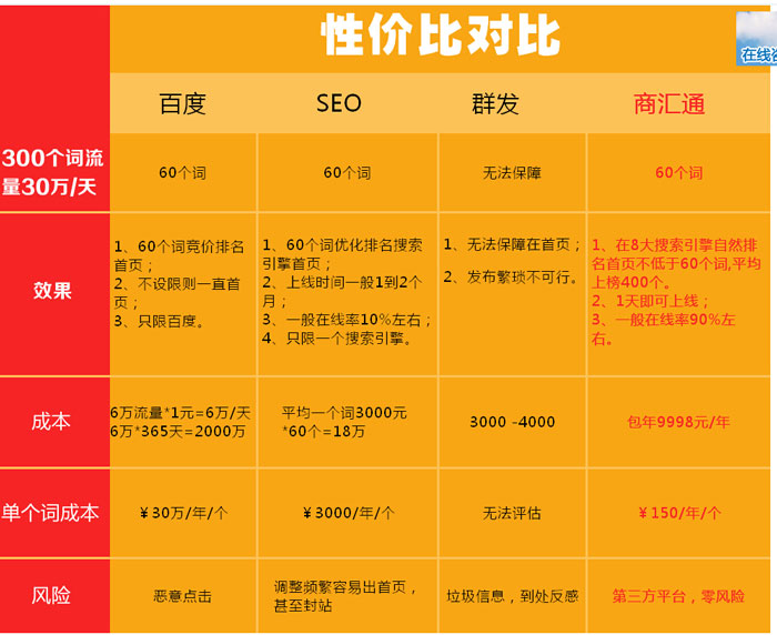 1、網(wǎng)絡(luò )營(yíng)銷(xiāo)成為新時(shí)代的寵兒!互聯(lián)網(wǎng)的發(fā)展,讓越來(lái)越多的人開(kāi)始重視并選擇網(wǎng)絡(luò )營(yíng)銷(xiāo)推廣!網(wǎng)絡(luò )營(yíng)銷(xiāo)大大改變了企業(yè)的營(yíng)銷(xiāo)方式! 二.企業(yè)網(wǎng)站宣傳推廣新助手-商匯通 "商匯通"是國內首家專(zhuān)注于搜索引擎首頁(yè)精準營(yíng)銷(xiāo)的電子商務(wù)云銷(xiāo)平臺,整合公司8年技術(shù)積累和優(yōu)秀合作平臺,幫助客戶(hù)實(shí)現成百上千個(gè)精準關(guān)鍵詞自然排名8大搜索引擎首頁(yè),方便、快捷、穩定實(shí)現企業(yè)搜索引擎推廣。 三.選擇我們的十大理由 1、五大搜索引擎首頁(yè)排名推廣!